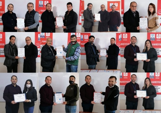 Milas'ta Mesleki Yeterlilik Belgesi Sınavlarına katılarak başarılı olan emlak danışmanları ve motorlu kara taşıtları alım satım sorumluları galericiler...
