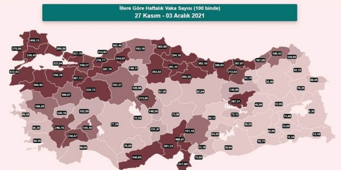 İllere göre haftalık vaka sayıları (100 binde) verilerine göre Karadeniz Bölgesi'nde vaka sayıları Artvin'de 100 binde 186,43 oldu. Rize'de 191,08. Trabzon'da 287,97. Gümüşhane'de 213,83. Bayburt'ta 31,74. Giresun 298,63. Ordu 362,19. Tokat 285,35. Amasya 261,11. Çorum 253,52. Samsun 294,16. Sinop 302,60. Kastamonu 193,16. Karabük 314,02. Bartın 192,48. Zonguldak 213,63. Düzce 279,77. Bolu'da ise vaka sayıları 100 bin 267,79 oldu.