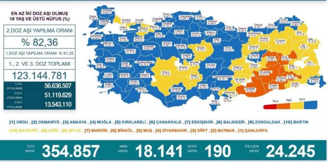 Türkiye genelinde en az 2 doz aşı olmuş 18 yaş ve üstü nüfus yüzdesine göre aşılama oranı en yüksek iller arasında Ordu 1. (yüzde 85,6), Amasya 3....