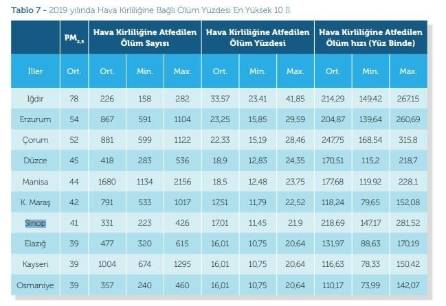 Aynı kurumca 2019 yılı verilerinden hazırlanan "Kara Rapor 2020"de de Sinop için dikkat çekici bir bilgi yer alıyor. Sinop 2019 yılında hava kirliliğine bağlı ölüm yüzdesi en yüksek 10 il arasında 7. Sırada yer alıyor. PM 2.5 değerinin baz alındığı bilgilerde 2019 yılında meydana gelen 30 yaş üstü (kazalar/dışsal yaralanmalar haricindeki) ölümlerde Sinop'un hava kirliliğine atfedilen ölüm yüzdesinin 17,01 olduğu belirtiliyor. Bunun karşılığında 331 ölüm yer alıyor.