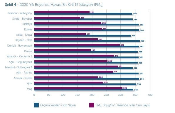 Rapora göre Muş, Iğdır, İstanbul, Sinop, Malatya, Edirne, Tokat, Kayseri, Denizli, Düzce, Karabük, Ağrı ve Ankara'daki 15 istasyonda 2020 boyunca yapılan ölçümlerde "yüksek hava kirliliği" gözlendi. Bu istasyonların bulunduğu bölgelerde Kovid-19 hastalığı pandemisi zamanında Mart ayında azalan taşıt trafiğine rağmen, tüm yıla bakıldığında DSÖ'nün kılavuz değerlerinin çok üzerinde kirli hava solunduğunun görüldüğü belirtildi.