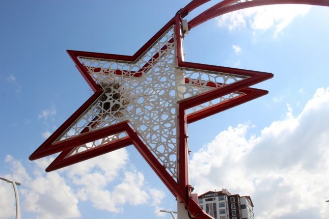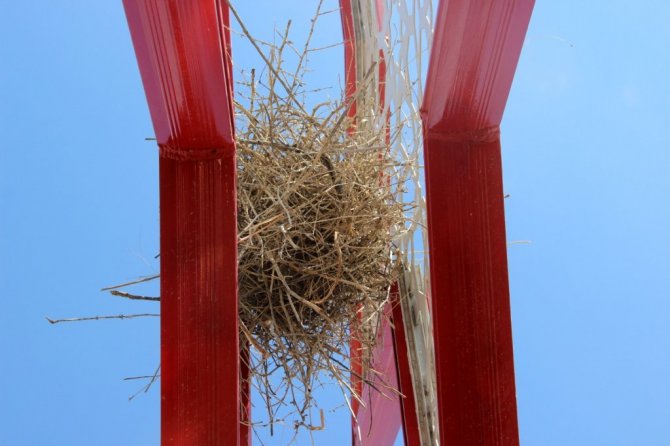 Kavşakta bulunan Türk bayrağı figürlü levhanın yıldız kısmında bulunan kuş yuvası görenlerin dikkatini çekiyor.