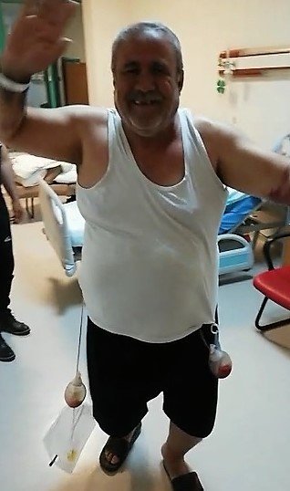 Kahramanmaraş'ın Pazarcık ilçesinde yaşayan Niyazi Topalca, 15 yıl önce karaciğer ameliyatı geçirdikten sonra aşırı kilo aldığı için şeker hastalığına yakalandı. Kilo veremediği için hastalığı ağırlaşınca Topalca, tekerlekli sandalye yardımıyla Kahramanmaraş Necip Fazıl Şehir Hastanesi'ne başvurdu. Yapılan tetkikler sonucu bağırsak ve obeziteden ameliyata alınan Topalca, ameliyat sonrası servise alındı. İki gün serviste kaldıktan sonra ayağa kalkan Topalca, çalan müzik eşliğinde oynayarak sağlığına kavuşmasını kutlarken, doktor ve salık çalışanlarına teşekkür etti.