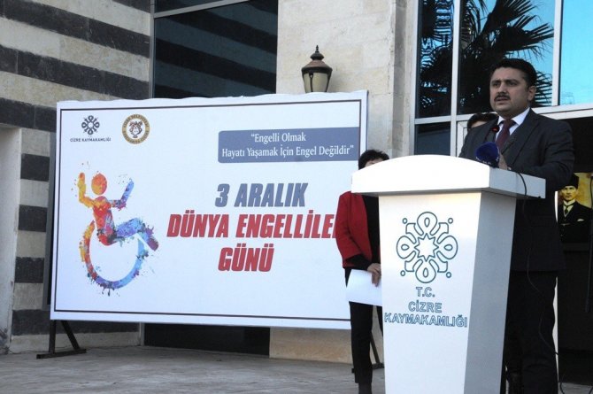 Kaymakamlık bahçesinde düzenlenen etkinlikte konuşan Cizre Kaymakamı ve Belediye Başkan Vekili Mehmet Tunç, "Bugün insanın insan olduğunu topluma haykırdığı, dünyaya haykırdığı çok önemli ve müstesna bir gün. Bizler insanı insan olduğundan dolayı seven bir toplumun, seven bir medeniyetin insanlarıyız. İnsanı yaşat ki devlet yaşasın mantığı ile hareket eden bir ecdadın çocuklarıyız. Engellilik sadece engellilerin veya engelli ailelerin maruz kaldığı bir sorunsal asla değildir. Ulusal ve Uluslar arası anlamda da insan olmanın insani anlamda yaradanın vermiş olduğu unsurlardan dolayı insanların eksikliklerinin asla ve asla göz önüne alınmadan insani anlamda toplumda birey, fert, düşünen, yaşayan, hisseden insanlar olarak değerlendirilmesi elzemdir" dedi.