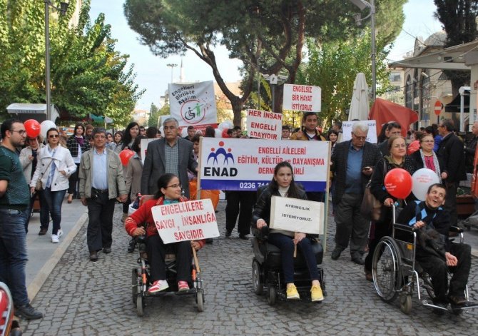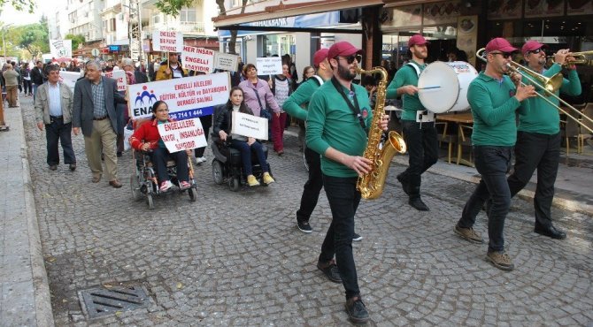 Manisa’nın Salihli ilçesindeki engelliler, Sosyal Hizmetler Merkezi Müdürlüğü tarafından düzenlenen organizasyonla bando eşliğinde dövizlerle farkındalık için yürüdü.