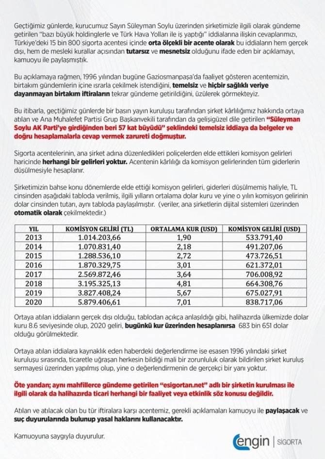 Engin Sigorta'dan yapılan yazılı açıklamada, "Geçtiğimiz günlerde, kurucumuz Sayın Süleyman Soylu üzerinden şirketimizle ilgili olarak gündeme getirilen "bazı büyük holdinglerle ve Türk Hava Yolları ile iş yaptığı" iddialarına ilişkin cevaplarımızı, Türkiye'deki 15 bin 800 sigorta acentesi içinde orta ölçekli bir acente olarak bu iddiaların hem gerçek dışı, hem de mesleki kurallar açısından tutarsız ve mesnetsiz olduğunu ifade eden bir açıklamayı, kamuoyu ile paylaşmıştık. Bu açıklamaya rağmen, 1996 yılından bu yana Gaziosmanpaşa'da faaliyet gösteren acentemizin, birtakım gündemlerin içine ısrarla çekilmek istendiğini, temelsiz ve hiçbir sağlıklı veriye dayanmayan birtakım iftiraların tekrar gündeme getirildiğini, üzülerek görmekteyiz. Bu itibarla, geçtiğimiz günlerde bir basın yayın kuruluşu tarafından şirket kârlılığımız hakkında ortaya atılan ve ana muhalefet partisi Grup Başkan Vekili tarafından da gelişigüzel dile getirilen "Süleyman Soylu AK Parti'ye girdiğinden beri 57 kat büyüdü" şeklindeki temelsiz iddiaya da belgeler ve doğru hesaplamalarla cevap vermek zarureti doğmuştur" ifadeleri kullanıldı.
