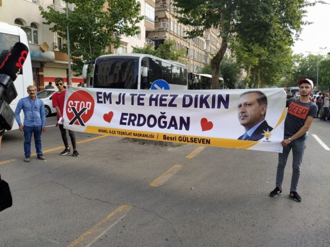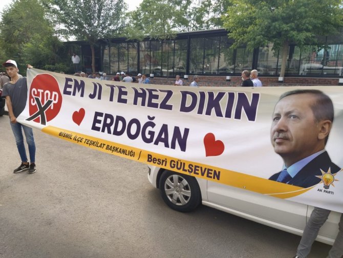 New York'taki Times Meydanı'nda terör örgütü FETÖ'nün yayınlattırdığı "Stop Erdoğan" yazılı aşağılık kampanyaya karşı Diyarbakır Bismil İlçe Teşkilatı sessiz kalmadı. Terör örgütü FETÖ'ye, AK Parti Bismil İlçe Teşkilat Başkanı Besri Gülseven, Cumhurbaşkanı Recep Tayyip Erdoğan'ın Diyarbakır ziyaretinde Kürtçe pankartla cevap verdi. Destek pankartında Kürtçe, "Em Ji Te hez dıkım" "Seni seviyoruz Erdoğan" anlamına gelen dev pankart açıldı.