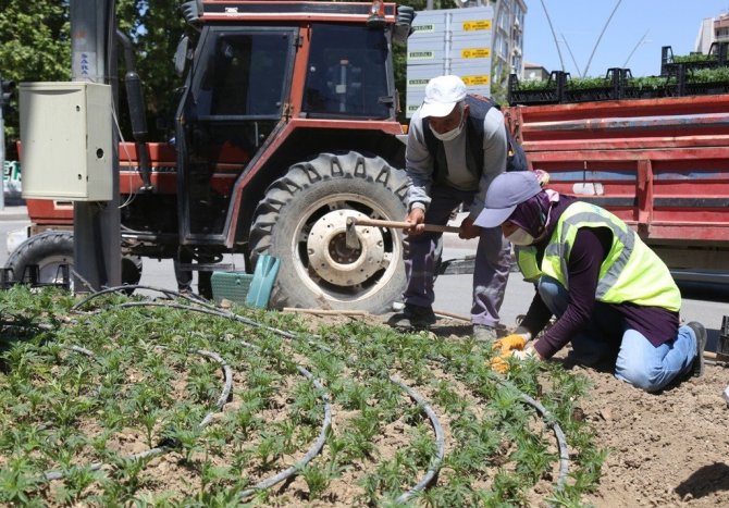 Konya'nın Ereğli İlçe Belediyesi Park ve Bahçeler Müdürlüğü ekipleri, kavşaklar ve refüjlerde çiçeklendirme çalışmaları gerçekleştiriyor.