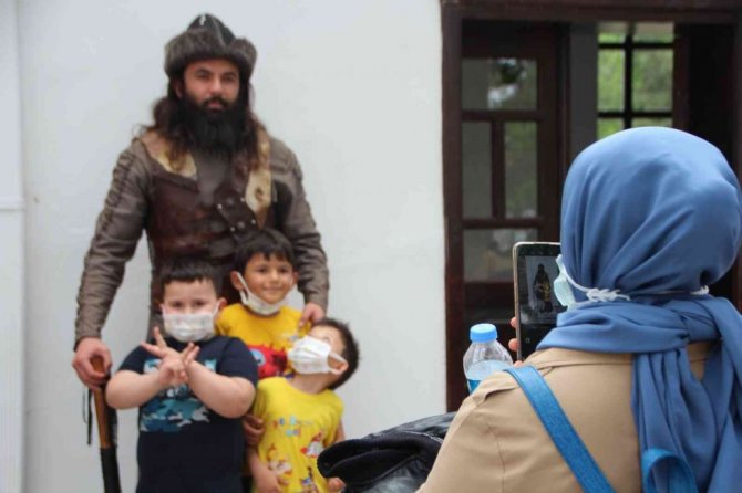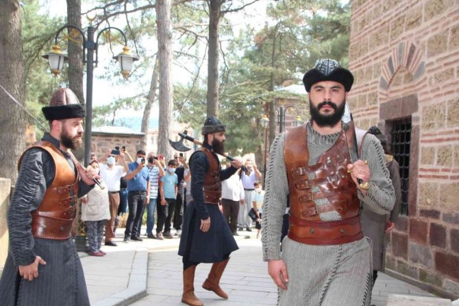 Osmanlı Devleti'nin kurucusu Osman Gazi'nin babası olan Ertuğrul Gazi'nin Bilecik'in Söğüt ilçesinde bulunan türbesinde, koronavirüs tedbirleri kapsamında gerçekleşen ziyaretler, geçtiğimiz haziran ayında yeniden açıldı. Jandarma Genel Komutanlığı ve Bilecik 2'nci Jandarma Er Eğitim Tugay Komutanlığı'nın katkılarıyla, Söğüt Ulaştırma Eğitim Merkez Komutanlığı'ndan 9'u uzman çavuş, 4'ü erbaş ve er olmak üzere 13 asker türbede görev alıyor. Alp kıyafetlerinin dikkati çektiği nöbetler, sabah 09.00'da başlayıp 19.00'a kadar devam ediyor ve her saat başında nöbet değişimi yapılıyor.