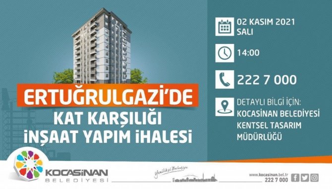 Öte yandan 2 Kasım 2021 Salı günü saat 14.00'de gerçekleştirilecek olan kat karşılığı ihalenin şartname ve eklerinin Kentsel Tasarım Müdürlüğü'nden temin edinilebileceği gibi 0(352) 222 70 00 numaralı telefondan da ayrıntılı bilgi alınabileceği kaydedildi.