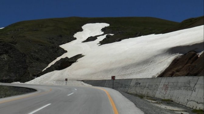 Erzurum'da haziran ayının gelmesine rağmen yüksek rakımlı yerlerde bulunan kar kütleleri henüz erimedi.