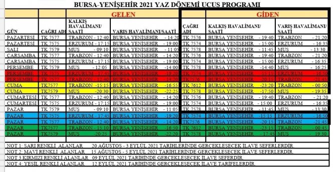 Pandemi sürecindeki normalleşmeyle birlikte yeniden uçuşlara açılan Bursa Yenişehir Havaalanında tüm uçuşlarda yüksek doluluk oranlarının yakalanmasıyla birlikte Erzurum, Muş ve Trabzon uçuşlarına yaz dönemi yeni ek seferler konularak sefer sayıları arttırıldı. AK Parti Bursa Milletvekili Mustafa Esgin, müjdeyi sosyal medya hesabından paylaştı. Esgin, "Teşekkürler Bursa" başlığıyla paylaştığı mesajında şu bilgileri verdi: "Pandemi döneminde 14 ay kapalı kalan Bursa Yenişehir Havaalanından uçuşları normalleşme süreciyle birlikte yeniden başlatmıştık. Yeniden uçuşlara açılan havaalanımızda ek seferlerle birlikte haftanın her günü uçuş var. Erzurum, Trabzon ve Muş uçuşlarımızdaki yüksek doluluk oranları yeni ek seferlerin konulmasında etkili oldu. Bursa Büyükşehir Belediyesinin her uçuş öncesi ve sonrasında Bursa kent merkezinden uygun fiyatlı yapmış olduğu transferlerle havaalanı ulaşımına kolaylık sağladı. Öncelikli olarak ulaşımlarında Bursa Yenişehir Havaalanımızı tercih eden hemşehrilerimize ve yüksek doluluk oranlarının artmasında emeği olan Erzurum, Muş ve Trabzon hemşehri derneklerimize teşekkür ediyorum. Mevcut uçuşların arkasında durarak ve doluluk oranlarımızı arttırarak dönemsel ek seferleri kalıcı hale getirebiliriz. Öncelikli hedefimiz Diyarbakır ve Gaziantep uçuşlarına bir an önce başlamaktır. Ayrıca Adana, Elazığ, Samsun, Ordu, Giresun, Sivas, Kars, Van, Ağrı, Şanlıurfa, Adıyaman, Malatya, Antalya ve Kıbrıs olmak üzere yeni uçuşlar elde etmemiz mümkün olacaktır. 3 milyon kişinin yaşadığı sosyal ve ekonomik yönden Türkiye'nin en dinamik şehirlerinden birisi olan Bursa, sadece yurt içi uçuşlarla değil yurt dışı bazı destinasyonlara da uçmak suretiyle daha ulaşılabilir kent olma vizyonunu gerçekleştirecektir. Biz, Bursa'ya inanıyoruz."