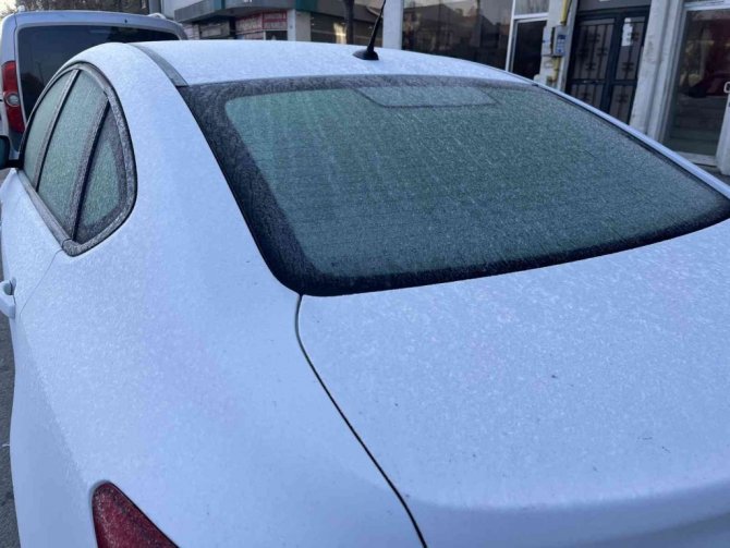 Eskişehir'de hava sıcaklığının gece sıfırın altına düşmesi ile yağan kırağıyla araç camları ve çimler buz tuttu.