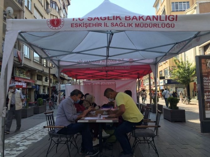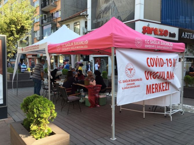 Eskişehir'de bazı caddelere kurulan "COVID-19 Aşı Uygulama Noktaları'nda aşı olmak isteyen vatandaşlar uzun kuyruklar oluşturdu.
