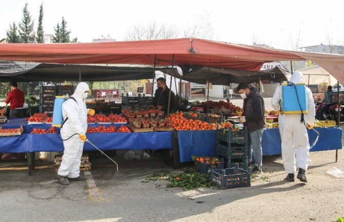 Hızlı bir yükselişin ardından duraklama dönemine giren vaka sayılarının yeniden artmaması için çaba gösteren Adana Büyükşehir Belediyesi ekipleri semt pazarlarındaki dezenfeksiyon çalışmalarını da aralıksız sürdürüyor.