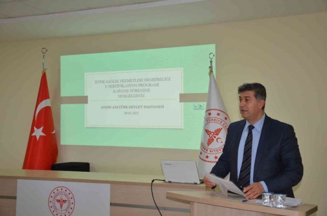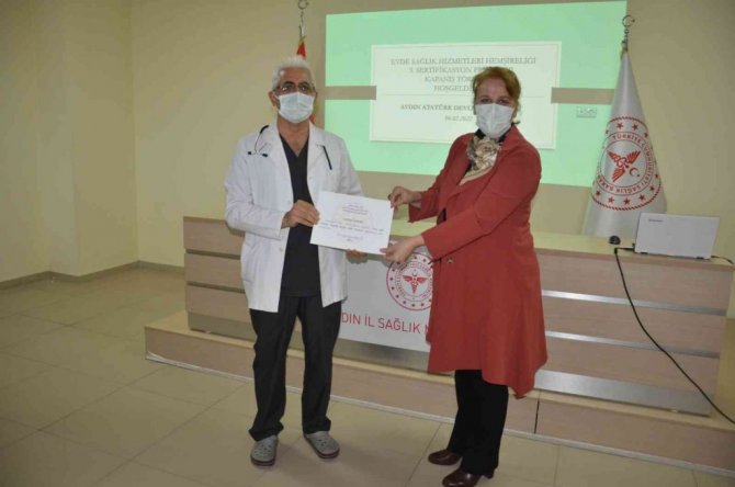 Evde sağlık hizmetleri hemşireliği sertifika programı kapsamında eğitim alan hemşireler, evde bakım gereksinimi olan hastayı ailesi ve çevresi ile birlikte bir bütün olarak değerlendirerek ona ihtiyacı olan tedavi, bakım ve rehabilitasyonun ev ortamında başlatılmasını, sürdürülmesini, takibini sağlama ile bunun için gerekli sosyal ve psikolojik destek hizmetlerini koordine etmek için çeşitliği eğitimlerden geçiyorlar. Bu kapsamda Aydın Atatürk Devlet Hastanesi'nde 5'incisi düzenlenen "Evde Sağlık Hizmetleri Hemşireliği Sertifikasyon Programı" sonlandırıldı. İl Sağlık Müdürlüğü Konferans Salonunda, Atatürk Devlet Hastanesi Başhekimi Op. Dr. Niyazi Kocakaplan, başhekim yardımcıları, sağlık hizmetleri müdürü, eğitmenler, kursiyerler ve davetlilerin katılımıyla kapanış ve sertifika töreni gerçekleşti. Her biri alanlarında uzman eğitmenlere desteklerinden dolayı teşekkür belgeleri takdim edilirken, kursiyerlere de katılım belgeleri verildi. Törenin ardından kursiyerlerle birlikte pasta kesimi gerçekleştirildi. Atatürk Devlet Hastanesi Başhekimi Op. Dr. Niyazi Kocakaplan programa katılan tüm hemşireleri tek tek tebrik ederek çalışma hayatlarında başarılar diledi.