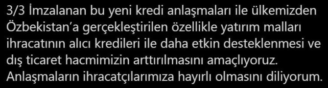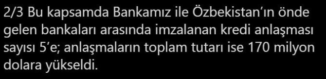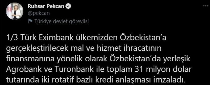 Ticaret Bakanı Ruhsar Pekcan, resmi sosyal medya hesabında Türk Eximbank ile Agrobank ve Turonbank arasında kredi anlaşması imzalandığını açıkladı. Bakan Pekcan, "Türk Eximbank ülkemizden Özbekistan'a gerçekleştirilecek mal ve hizmet ihracatının finansmanına yönelik olarak Özbekistan'da yerleşik Agrobank ve Turonbank ile toplam 31 milyon dolar tutarında iki rotatif bazlı kredi anlaşması imzaladı. Bu kapsamda bankamız ile Özbekistan'ın önde gelen bankaları arasında imzalanan kredi anlaşması sayısı 5'e, anlaşmaların toplam tutarı ise 170 milyon dolara yükseldi" ifadelerini kullandı.