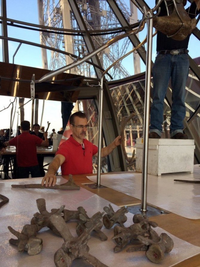 Fransa’nın başkenti Paris’te bulunan Eyfel Kulesi’nin ilk katında Jura Devrine ait teropod türü dinozor iskeleti açık artırmada satılmak üzere sergileniyor. Büyüklüğü 9 metre ve genişliği 2.5 metre olan dinozorun 157 ile 152 milyon yıllık olduğu tahmin ediliyor. 2013 yılında ABD’nin Wyoming bölgesinde keşfedilen iskelet, 4 Mayıs gününe kadar sergilenecek. Bu açık artırma ile birlikte, Eyfel Kulesi’nde 3. kez açık artırma etkinliği düzenleniyor.