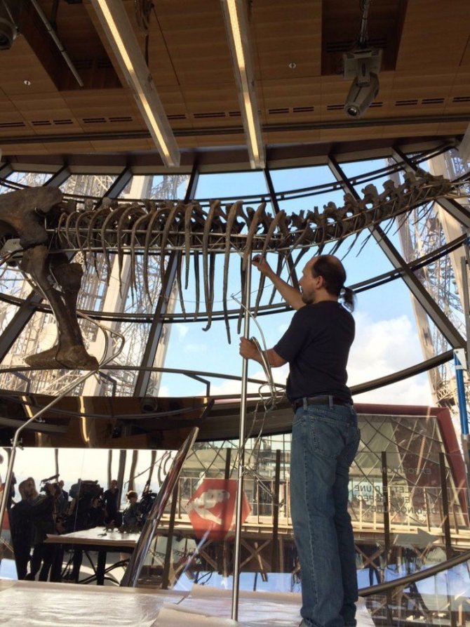 Paris’in sembolü haline gelen Eyfel Kulesi’nde Jura Devrine ait teropod türü dinozor sergileniyor.