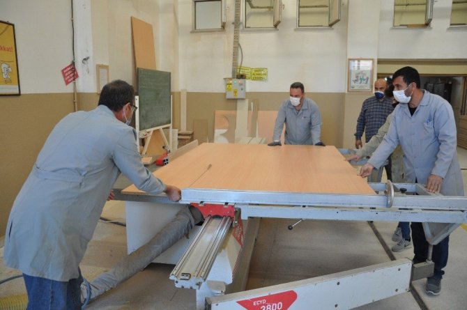 Mobilya Bölümü öğretmeni ve atölye şefi Mustafa Tor, günde 40 tabaka malzeme kesimi ile 330 öğretmen dolabı ve 990 öğrenci dolabı imalatına devam ettiklerini belirtti.