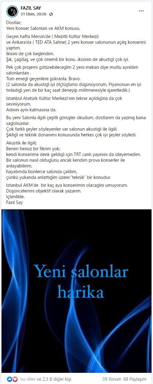 Paylaşımında, geçen hafta iki salonda açılış konserleri gerçekleştirdiğini belirten Say, "Geçen hafta Mersin'de (Mezitli Belediyesi Kültür Merkezi) ve Ankara'da (TED ATA Sahne) 2 yeni konser salonunun açılış konserini yaptım. Şık, çağdaş ve çok önemli bir konu; ikisinin de akustiği çok iyi. Pek çok projemi götürebileceğim iki yeni mekân diye mutlu ayrıldım salonlardan. Tüm emeği geçenlere şükranla. Bravo. (İki salonda da akustiği iyi ölçtüğümü düşünüyorum. Piyanonun en iyi tınladığı yeri de birkaç saat deneyip milimetresiyle işaretledik.)" ifadelerini kullandı.