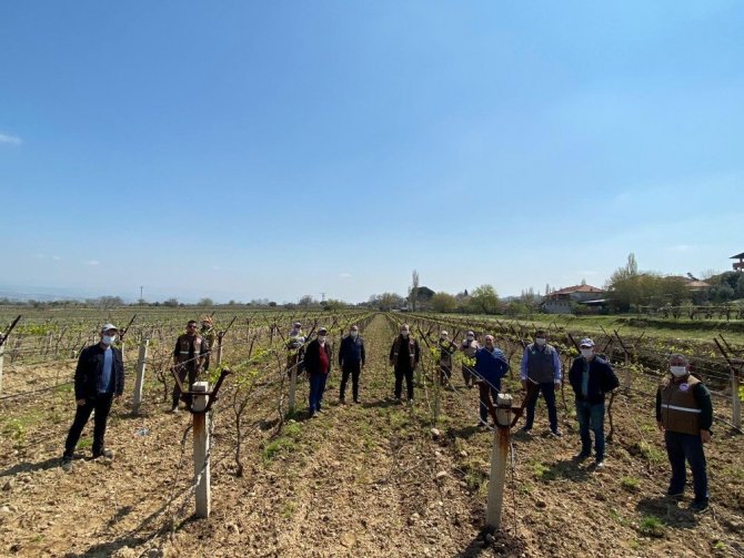 Amaçlarının bağlardaki en önemli ürün kaybına yol açan salkım güvesi hastalığının önüne geçmek olduğunu belirten Ziraat Odası Başkanı Cem Yalvaç, feromon tel uygulamasının son derece yararlı bir çalışma olduğunu söyledi. Yalvaç, “Salkım güvesine önlem olarak asılan feromon tellerin üzerinde kaplı olan maddenin kokuyla zararlı kelebeklerin dişisi ile erkeği birbirlerini bulamıyor ve çiftleşme olmadığı için üründe zarara yol açan yumurtlama olayı gerçekleşmiyor” dedi.