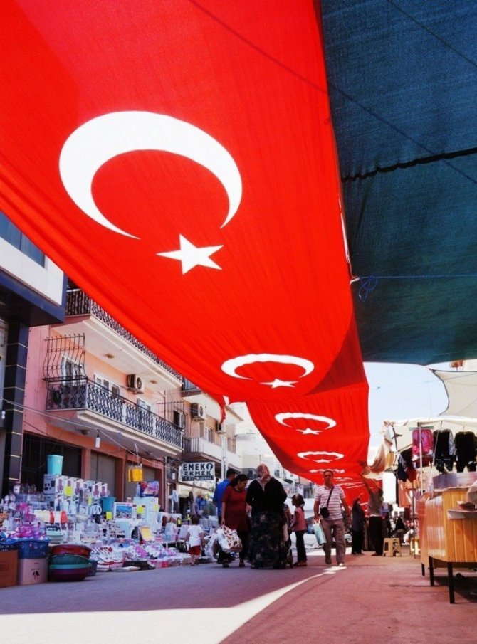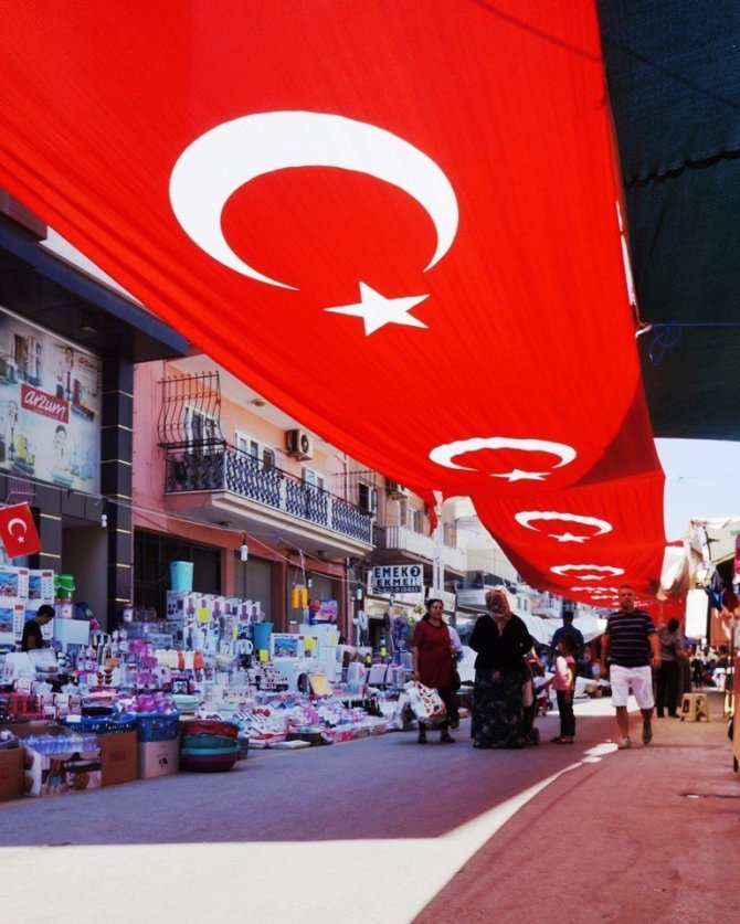 Sarıgöl 13. Geleneksel Sultaniye Üzüm Festivali kapsamında Alaşehir Caddesi’ne 500 metre uzunluğunda dev Türk Bayrağı asılarak açılan standların üzeri cadde boyunca kaplandı.