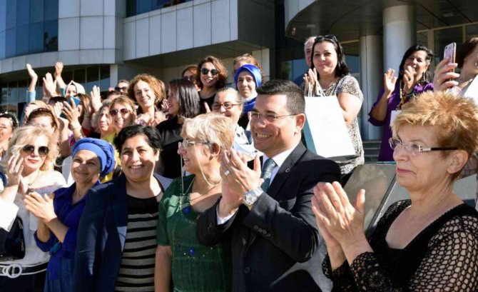 Kepez Belediye Başkanı Hakan Tütüncü, daha sonra emekçi kadınlarla belediye bahçesinde hatıra fotoğrafı çektirdi.