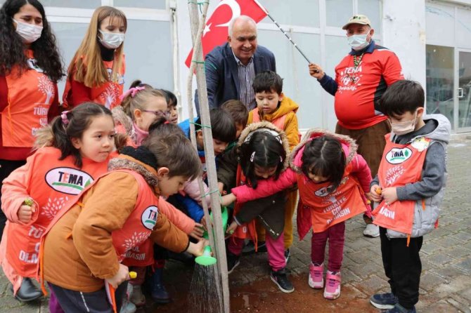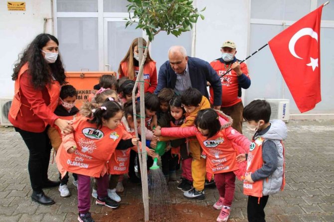 Mersin'in Erdemli ilçesinde bin adet fidanı toprakla buluşturan çocuklardan bazıları ilk can suyunu da suluklarıyla vererek örnek oldu.