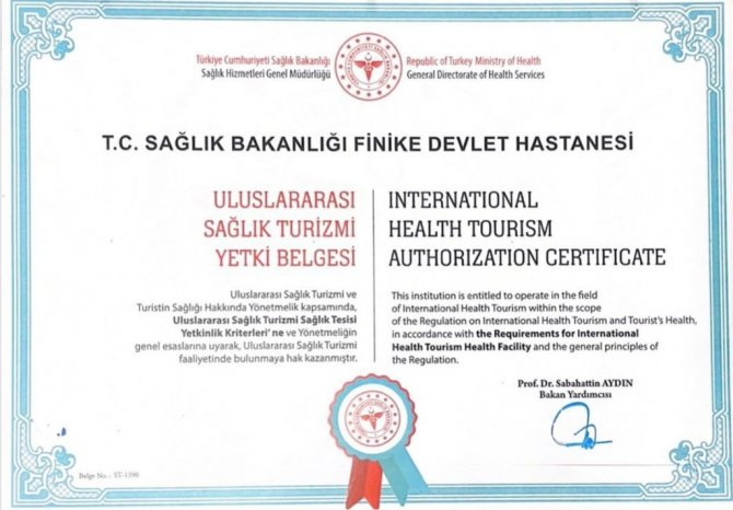 Antalya Finike Devlet Hastanesi, Sağlık Turizmi Yetkilendirme Belgesi aldı.