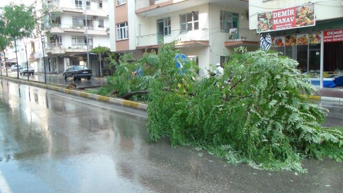 Antalya'da yaz gününde yağan yağmur ve yaşanan fırtına sırasında Serik ilçesinde refüjde bulunan ağaç yola devrildi.