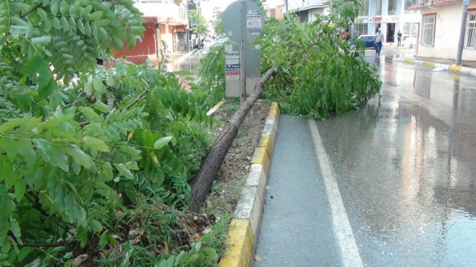 Esnaf Mehmet Demir, "Yağmur, fırtına bir anda geldi. İki tane ağaç yıkıldı. Biri otobüsün üstüne diğeri taksini üzerine yıkıldı. Ağaçları kenara kaydırdık. Yolu trafiğe açtık bir süre sonra belediye ekipleri geldi ve ağaçları tekrar yerine gömdü" diye konuştu.