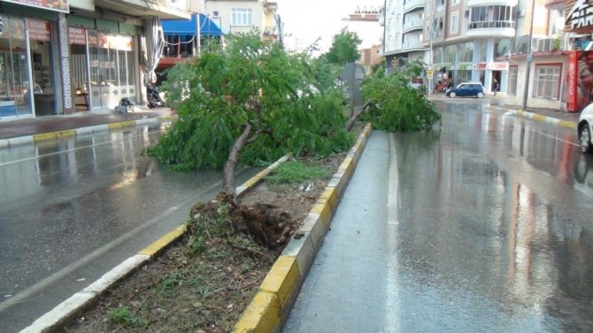 Antalya'nın Serik ilçesinde dün aniden gelen yağmur ve fırtına etkili oldu. Bazı ağaçlar devrildi ve caddelerde su birikintileri oluştu. Serik ilçesine bağlı Kökez Mahallesi'nde meydana gelen fırtınada, refüjdeki ağaçlar da yerinden sökülüp yola devrildi. Yaşananlar saniye saniye güvenlik kameraları tarafından kaydedildi Park halinde bulunan bir araç, şoförün erken davranması ile zarar görmekten son anda kurtuldu. Yaşanan fırtına sonrası sürücüler ile çevrede bulunan vatandaşlar yıkılan ağaçları yolun kenarına çekti. Daha sonra yıkılan ağaçlar belediye ekipleri tarafından aynı yere dikildi.