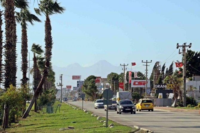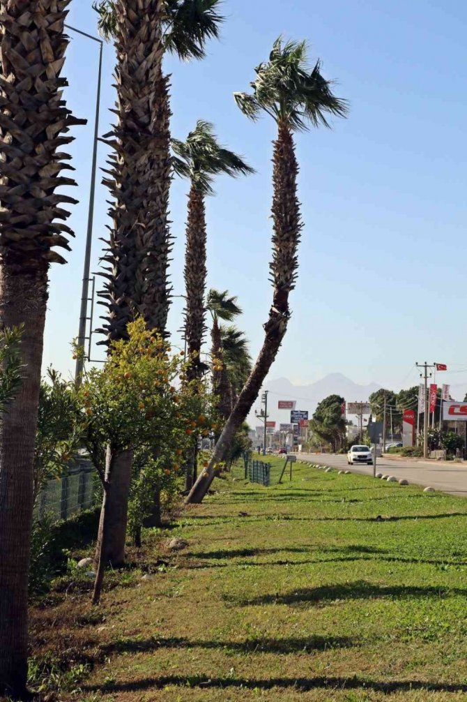 Antalya'da aynı sıradaki onlarca palmiyeye oranla yatık görüntüye sahip olan dev palmiye ağacı, fırtınalı havalarda görüntüsüyle sürücüleri tedirgin etmeye yetiyor.