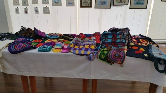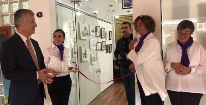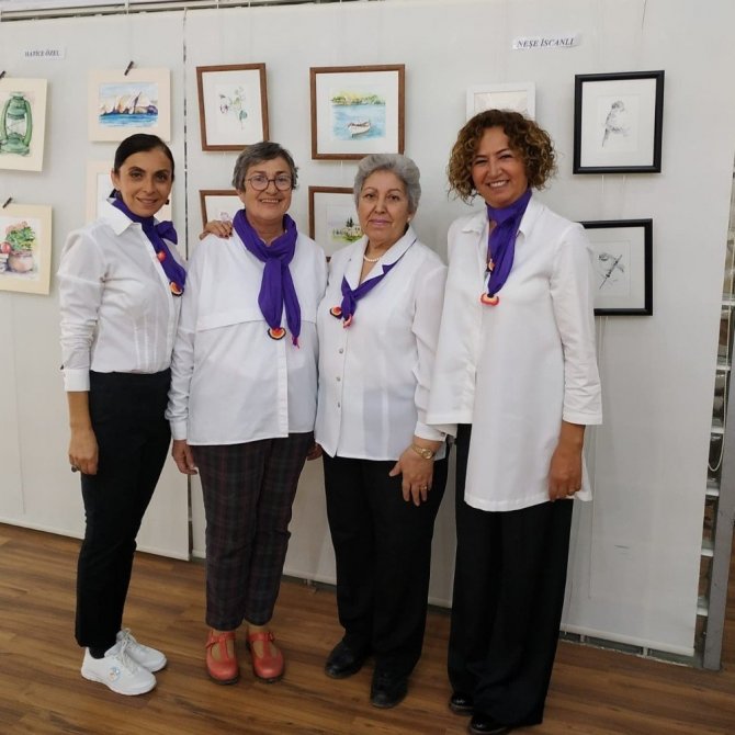 İzmir’in Foça ilçesindeki kadın sanatçılar, resim ve el sanatları sergisi açarken, sanatçılar, kadına şiddete dikkat çekmek için mor fular taktı.
