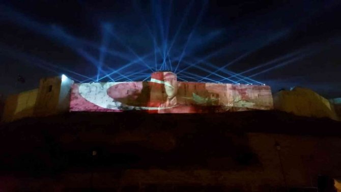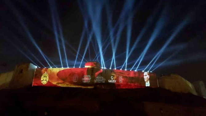 Gaziantep Büyükşehir Belediyesi tarafından Gaziantep Kalesi'nde şehrin Kurtuluşu'nun Yüzüncü Yılı Kutlama Etkinlikleri kapsamında ışık gösterisi yapıldı, mücadele fotoğrafları yansıtıldı.