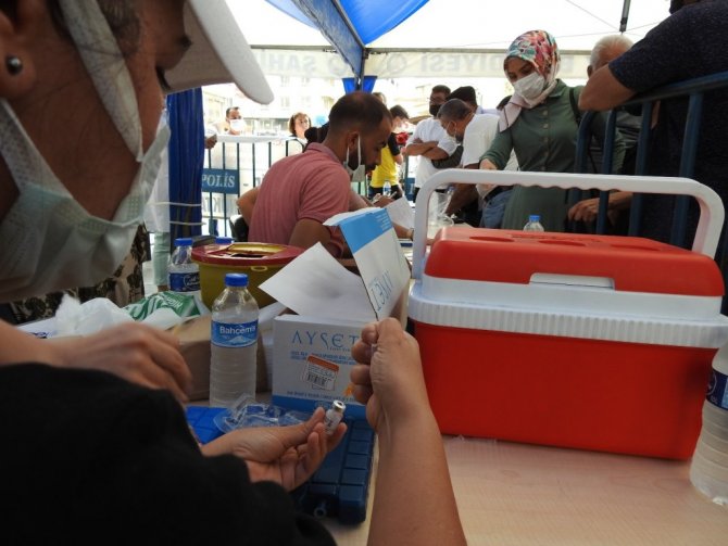 Aşılama çalışmalarının hızlı bir şekilde ilerlediği Gaziantep'te İl Sağlık Müdürlüğü ekipleri tarafından alışveriş merkezlerinde, kırsal mahallelerde, fabrikalarda ve kentin yoğun bölgelerinde oluşturulan mobil stantlarda vatandaşlara randevusuz bir şekilde aşı hizmeti veriliyor. Kentin en yoğun bölgelerinden biri olan Balıklı Meydanı'nda kurulan stantta ise günlük 500 vatandaş korona virüs aşısı oluyor. Yer yer kuyrukların oluştuğu stantta görev alan hemşire Gülay Beken, vatandaşları aşı olmaya davet etti.