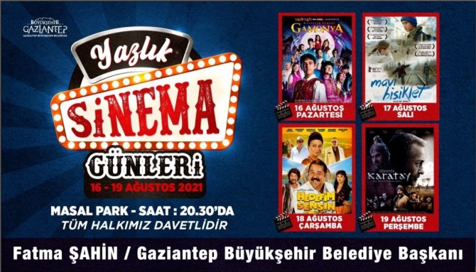 Sosyal ve kültürel belediyecilikte birçok çalışmaya imza atan Gaziantep Büyükşehir Belediyesi, eski yazlık sinemaları tekrar canlandırıyor. Büyükşehir Belediyesi Kültür ve Turizm Daire Başkanlığı'nca tarafından organize edilen sinema gösterimlerinin ilki 16 Ağustos saat 20.30'da Masal Parkı'nda gerçekleşecek. 4 gün boyunca her gün farklı bir film gösterilecek. Eski yazlık sinema günlerini yad ettirecek programlarda vatandaşlara açık havada film izleme keyfini yaşayacak. Masal Parkı'nda 16 Ağustos Pazartesi Günü Tuğçe Soysop'un yönetmenliğini üstlendiği Fantastik Macera Filmi Gamonya: Hayaller Ülkesi ile başlayacak olan Yazlık Sinema Günleri, 17 Ağustos Salı Günü yönetmen Ümit Köreken'in senaryosunu yazıp yönettiği 2016 yılı yapımı Dram türü Mavi Bisiklet izleyicilerle buluşacak. 18 Ağustos Çarşamba Günü ise senaryosunu ünlü komedyen Ata Demirer'in yazdığı, yönetmen koltuğuna Kıvanç Baruönü'nün oturduğu komedi filmi Hedefim Sensin filmi yayınlanacak. Masal Parkı'nda ki son gösterim ise 19 Ağustos Perşembe Günü Selahattin Sancaklı'nın yönettiği, 2018 yapımı macera, aksiyon ve tarihî film Diriliş Karatay ile olacak. Filmler her gün saat 20.00'da başlayacak.