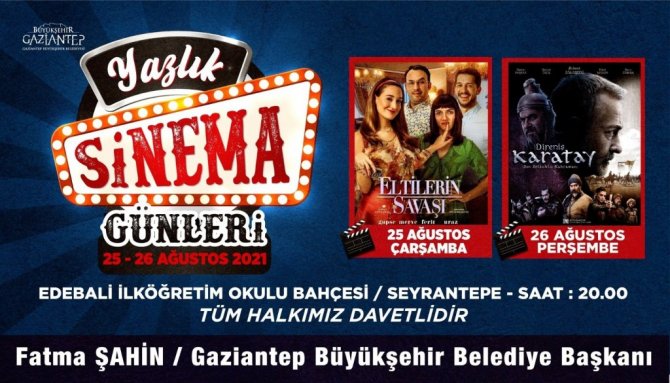 Vatandaşları nostaljik sinema günlerine götüren, Gaziantep Büyükşehir Belediyesi ve Kültür Turizm Bakanlığı tarafından gerçekleşen "Yazlık Sinema Günleri", Masal Park'ta yapıldı. 4 gün süren ve vatandaşların yoğun ilgisini gören etkinlikte, Gaziantepliler için eskiyi yad ettirdi, yazlık sinemayı deneyimleme fırsatı verdi. Bu kapsamda Gazi şehirliler için düzenlenen Yazlık Sinema Günleri adresi değiştirerek 20-21-22 Ağustos tarihlerinde Hasan Celal Güzel Millet Bahçesi'nde devam ederken, 23-24 Ağustos'ta Gazikent'te bulunan Gürteks Mehmet Hayri Özkaya İlköğretim Okulu Bahçesi'nde ve 23-24 Ağustos tarihlerinde Seyrantepe'de Edebali İlköğretim Okulu Bahçesi'nde devam edecek.