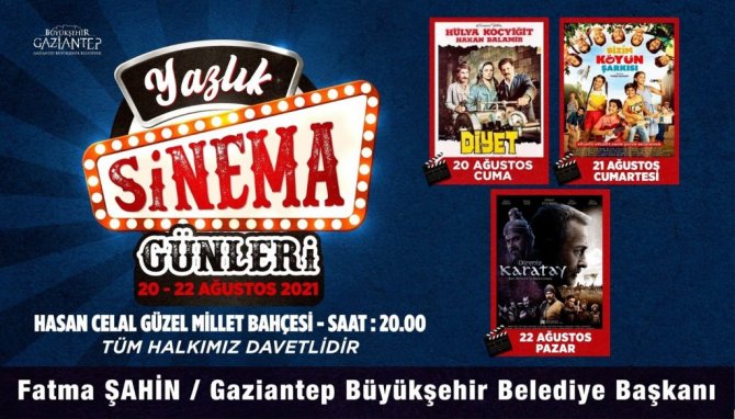 Hasan Celal Güzel Millet Bahçesi'nde düzenlenecek Yazlık Sinema Günleri'nin 20 Ağustos'ta ki ilk filmi yönetmenliğini Lütfi Akad'ın yaptığı 1974 yapımı Türk filmi Diyet gösterilecek. Sinema Günleri'nin devamında 21 Ağustos Cumartesi Günü Başrolünde çocukların oynadığı, Tuğçe Soysop'un yönettiği 2018 yapımı arkadaşlığı anlatan film Bizim Köyün Şarkısı olacak. Hasan Celal Güzel Millet Bahçesi'nde son gösterim 22 Ağustos Pazar Günü 19 Ağustos Perşembe Günü Selahattin Sancaklı'nın yönettiği, 2018 yapımı macera, aksiyon ve tarihî film Diriliş Karatay sinema severlerle buluşacak. Gazikent'te ki sinema günlerinde ise 23 Ağustos Pazartesi Günü yönetmen Ümit Köreken'in senaryosunu yazıp yönettiği 2016 yılı yapımı Dram türü Mavi Bisiklet, 24 Ağustos Salı Günü yönetmenliğini Lütfi Akad'ın yaptığı 1974 yapımı Türk filmi Diyet gösterimde olacak.
