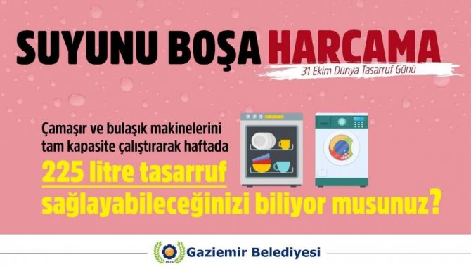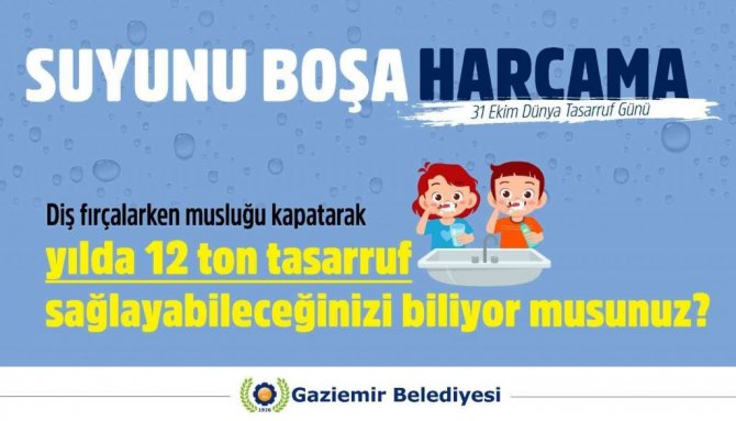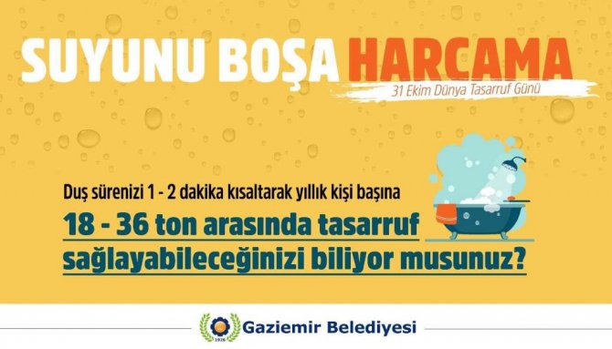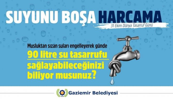 Gaziemir Belediyesi, 31 Ekim Dünya Tasarruf Günü'nde hazırladığı görsel çalışmalarla su tasarrufuna dikkat çekti. Belediye, yaptığı farkındalık kampanyasıyla "Suyunu boşa harcama" mesajı verdi.