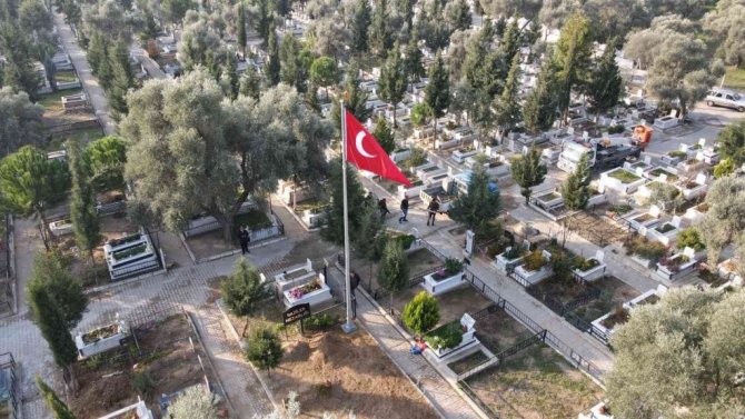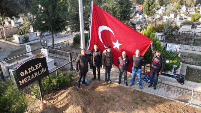 Nazilli Belediyesi Fen İşleri Müdürlüğü ekipleri, Belediye Başkanı Kürşat Engin Özcan'ın talimatı ile Yeşil Mahalle'de bulunan Gaziler Mezarlığı'na Türk bayrağı dikti.