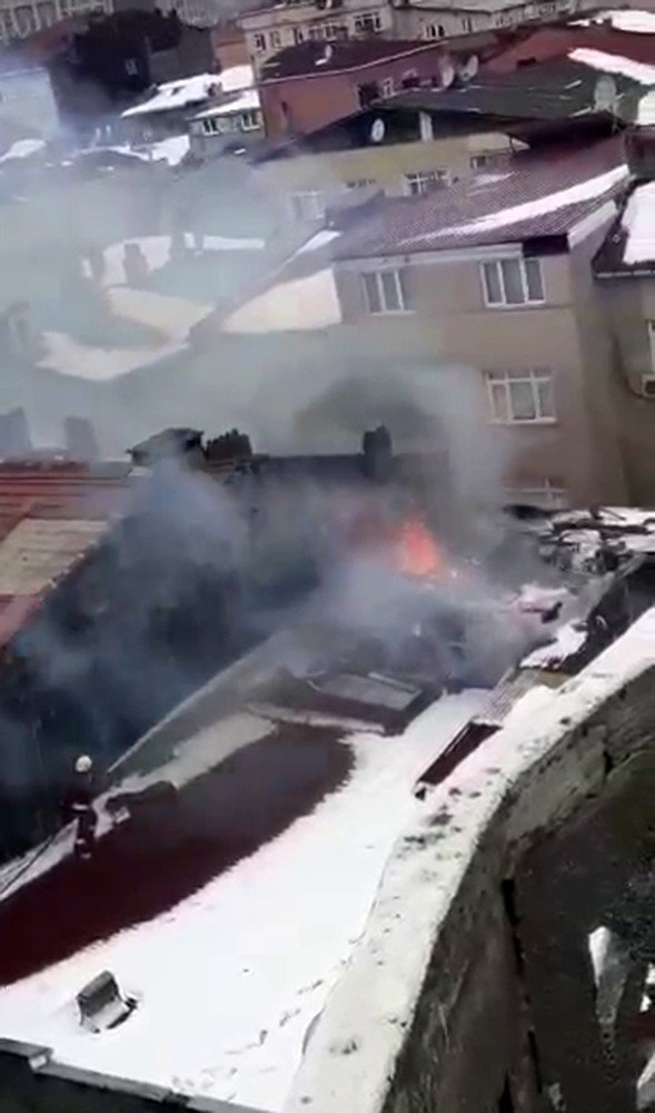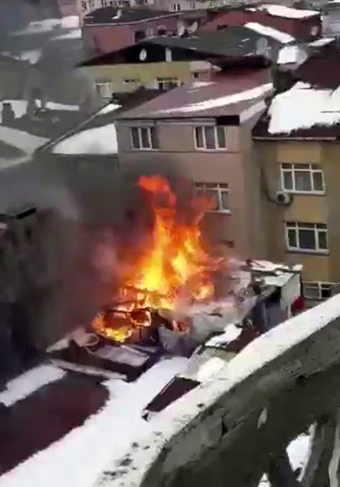 Gaziosmanpaşa’da bir evin kuş beslenen ve çöplüğü andıran çatısında yangın çıktı. Alev alev yanan çatıdaki eşyalar cep telefonu kameralarına yansıdı.