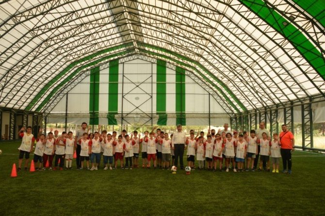 Başkan Akçadurak, Yaz Futbol Okulu'na katılan öğrencilerle ve eğitmenlerle hatıra fotoğrafı çektirdi.