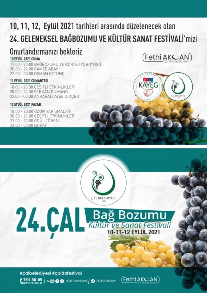 Türkiye'nin önemli üzüm merkezlerinden olan Denizli'nin Çal İlçesi'nde üzüm bağlarında hasat süreci tüm hızıyla devam ederken, 10-12 Eylül 2021 tarihleri arasında 24'üncü Çal Bağbozumu Kültür ve Sanat Festivali yapılacak. Binlerce üretici, üç gün sürecek olan festivalde yılın yorgunluğunu ve stresini atacak. Festivalin ilk günü fotoğraf yarışmasında dereceye giren 28 fotoğrafın yer aldığı sergi, saat 18.00'de başlayacak. Aynı gün akşam saat 20.00'de Gamze Abay, saat 22.00'de ise Osman Öztunç konser verecek. 11 Eylül Cumartesi Günü, ilçe merkezinde çeşitli etkinlikler düzenlenecek ve akşam saatlerinde Serkan Dumano ve Ankaralı Ayşe Dinçer konseri yapılacak. 12 Eylül Pazar Günü ise, en iyi üzüm üreticisi yarışmaları ve çeşitli etkinliklerin ardından Buray konseri ile son bulacak.