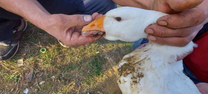 Gebze'ye bağlı Denizli Göleti'nde balık tutan vatandaşlar, kazın diline ve sırtına misina kancalarının takıldığını fark etti. Kazı sudan çıkaran vatandaşlar, kendi imkanlarıyla kancaları çıkarmaya çalıştı. Kaza zarar vermekten korkan vatandaşlar durumu itfaiye ekiplerine bildirdi. İhbar üzerine olay yerine itfaiye ekipleri sevk edildi. Ekiplerin ve vatandaşların müdahalesiyle kaza takılan kancalar çıkarıldı. Kaz, tedavisi yapılmak üzere veteriner hekime teslim edildi.