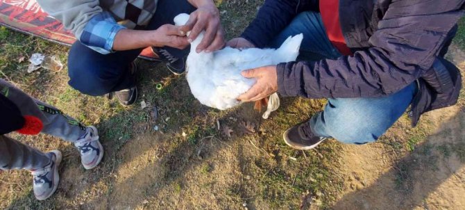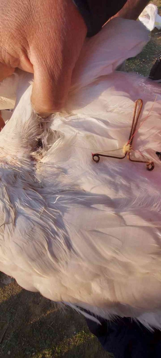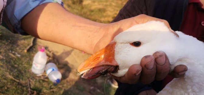 Gelişigüzel atılan misina kancaları kazın diline ve sırtına takıldı