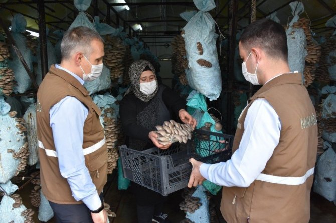Manisa İl Tarım ve Orman Müdürü Metin Öztürk, Alaşehir İle Tarım ve Orman Müdürü Musa Akkaynak ile birlikte Melek Kızıltepe’nin kurduğu mantar serasında incelemelerde bulundu.