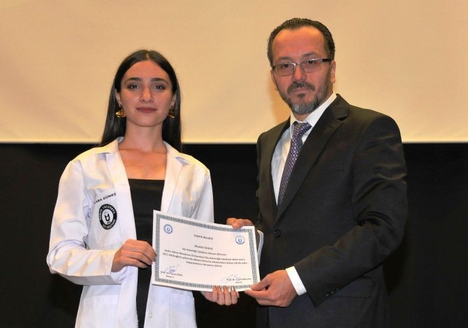 Konuşmaların ardından Rektör Prof. Dr. Cavit Bircan, dönem birincisi Dilara Güneş’e takdir belgesini vererek beyaz önlüğünü giydirdi. Prof. Dr. Halil Kırnak, dönem ikincisi Şeyma Kurtuluş’a, Aydın Diş Hekimleri Odası Başkanı Dr. Günhan Eskicioğlu ise dönem üçüncüsü Eda Odabaş’a belgesini vererek beyaz önlüklerini giydirdi.