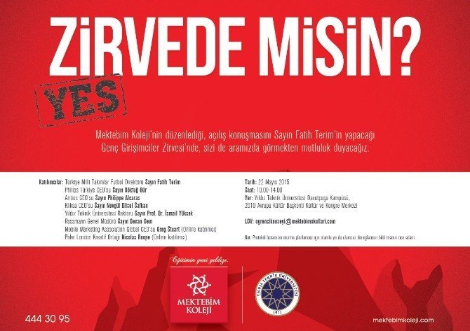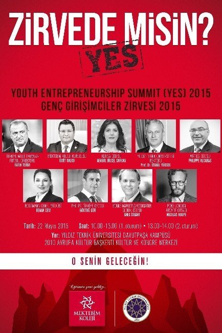 Yıldız Teknik Üniversitesi Davutpaşa Kampüsü Kongre Merkezi’nde yarın saat 10.00’da başlayacak olan Genç Girişimciler Zirvesi 2015’te konusunda uzman ulusal ve uluslararası başarılara sahip birçok önemli isim öğrencilerle buluşuyor. Mektebim Koleji’nin bu yıl ilk kez düzenlediği Zirve’de Mektebim Koleji lise öğrencileri, girişimcilik ruhunu ve girişimcilik hikâyelerini konunun uzmanlarından dinleyecek. Zirve’ye Türkiye Milli Takımlar Futbol Direktörü Fatih Terim, Philips Türkiye CEO’su Göktuğ Gür, Airties CEO’su Philippe Alcaras, TEB Girişim Bankacılığı Pazarlama Müdürü İbrahim Coşkuner, Mektebim Koleji Kurucusu Ümit Kalko, Yıldız Teknik Üniversitesi Rektörü Prof. Dr. İsmail Yüksek, Kliksa CEO’su Nevgül Bilsel Safkan, Rossmann Genel Müdürü Benan Cem, Mobile Marketing Global CEO’su Greg Stuart, Poke Lonson Creative Partner’ı Nicolas Roope ve Fedex Türkiye Direktörü Ali Gürdal konuşmacı olarak katılacak.